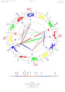 Sonneningress Skorpion 23.10.2013, 08.10‘.30‘‘ Uhr Düsseldorf Radix (Anlagen-Chancen) Das Bild liegt auf dem 7. Strahl (Zeremonielle Magie, Rythmus und Ordnung). Neubeginn bei K1 direkt nach dem AC. Viele verschiedene Motivationen