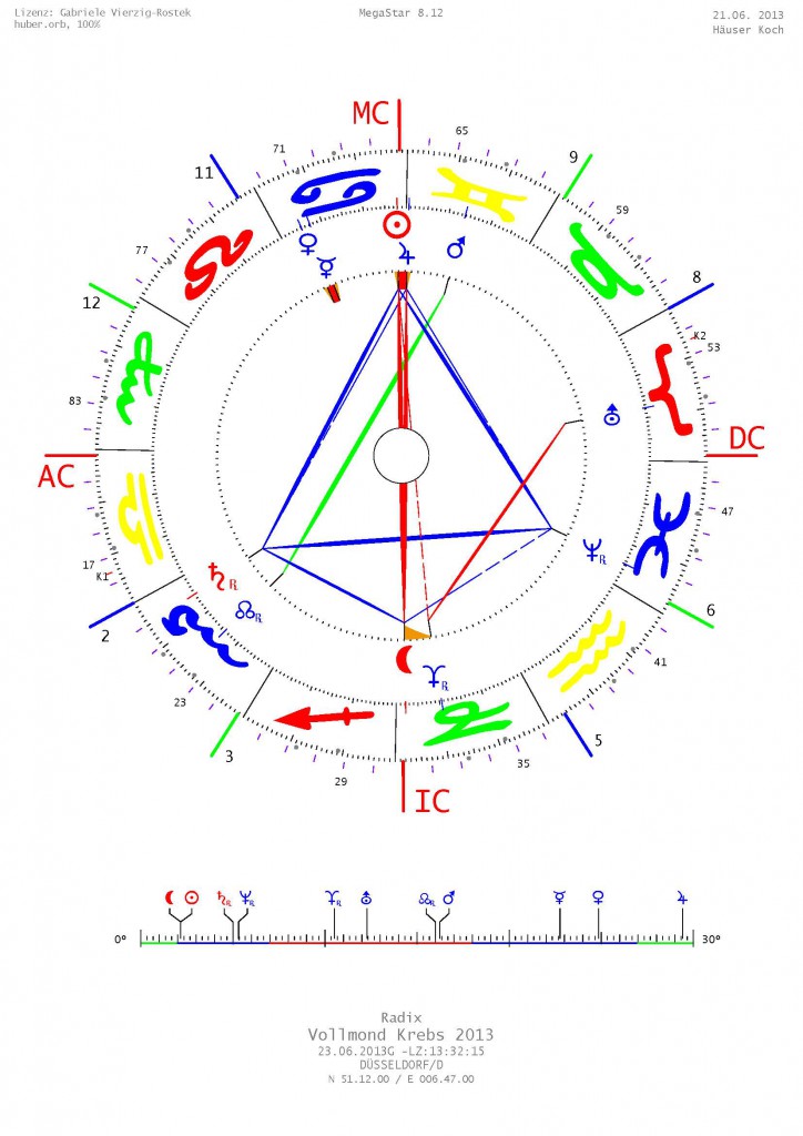 Mond verbindet sich mit Pluto (Gewissen, Härte) und das Quadrat von Pluto zu Uranus schneidet die Existenzachse ab. Illusionen und/oder Täuschungen, die sich dort noch befinden könnten, werden so u.U. eliminiert.