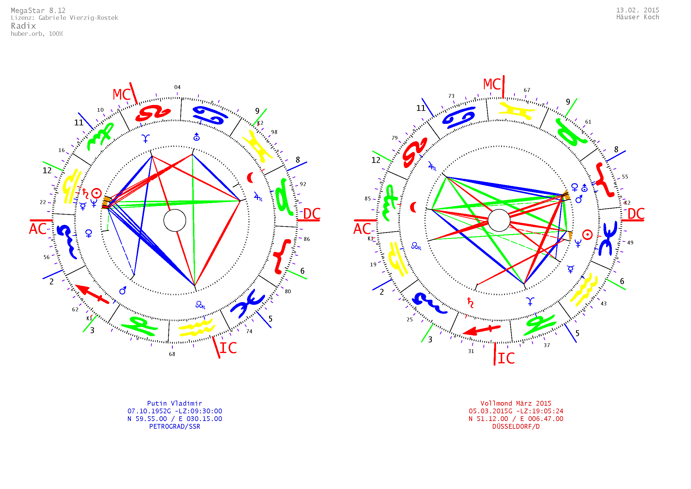 Ein kurzer Blick zum Vergleich mit dem Radix von W.Putin zeigt, dass seine Großkonjunktion mit zwei Persönlichkeitsplaneten und Neptun-Merkur genau in die Öffnung der Fischräuse vom Vollmondhoroskop fällt. (Über das Horoskop hatte ich bereits berichtet: https://www.astrologie-lebensberatung.de/putin-im-hoehenflug/ ) Also zumindest aus dem Blickwinkel von Düsseldorf wirkt es so, als sei seine Person das ausfüllende Element des gesamten Bildes. Und der Transit-Uranus in Konjunktion mit Venus und Mars steht genau in Opposition zu Putins Stellium in Waage!