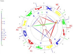 Das Horoskop ist großrahmig, voller Energie und hat wieder Ambivalenz im Aspekt-Bild.