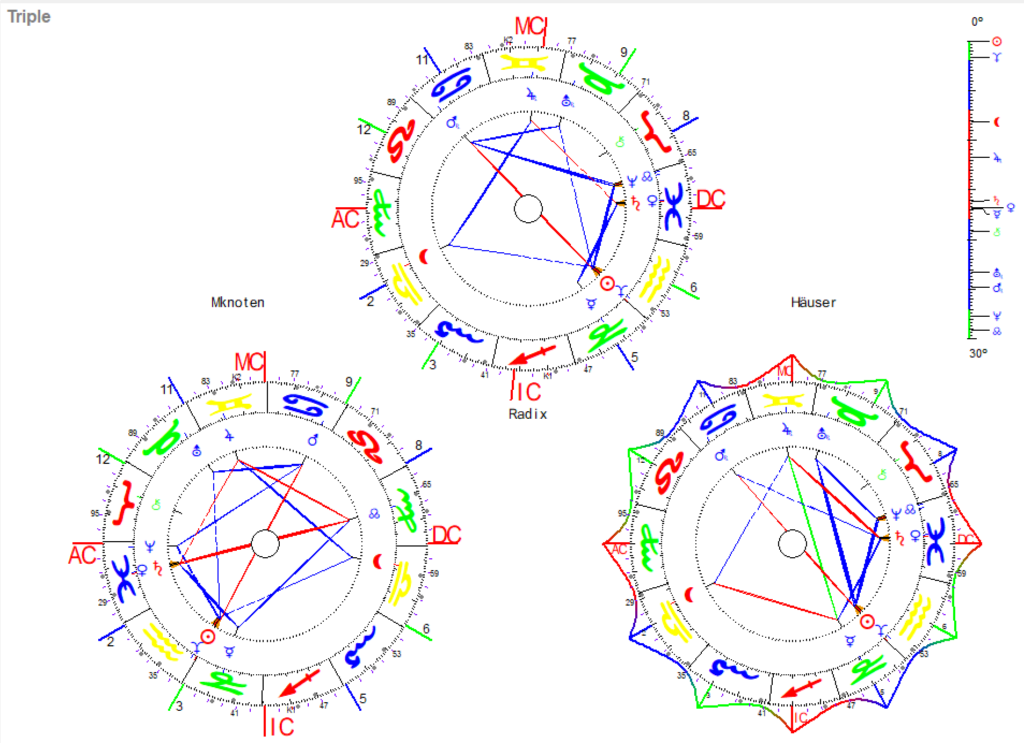 Die Aspekt Figur im Häuser Horoskop bekommt ein Quinkunx, daher nun die Chance auf lösungsorientiertes zukunftsfähiges Denken (Jupiter-Merkur, dreifach in Erfahrungsdreiecken, mal mit Gefühl und mal mit Sicherheitsbedenken).
