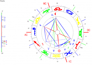 Die stabile Rechtschaffenheits-Figur steht senkrecht und wird mit Sonne-Mond-Jupiter und Uranus zur Hauptaufgabe: aufrecht bedeutet auch Aufrichtigkeit, viel Inhalt gibt den Takt vor, großzügig und freundlich zu bleiben, die Sinne offen zu halten, eigen Bedürfnisse zu erkennen, sie aber in der echten Realität mit den Maßgaben der notwendigen Existenzgrundlagen zu beachten. Gefühl und Verstand auf der Wassermann-Löwe-Achse eingeschlossen in 3/9 beschäftigen sich mit ganz eigenen, vielleicht ungewöhnlichen Denkmodellen, die sich noch konkretisieren müssen.