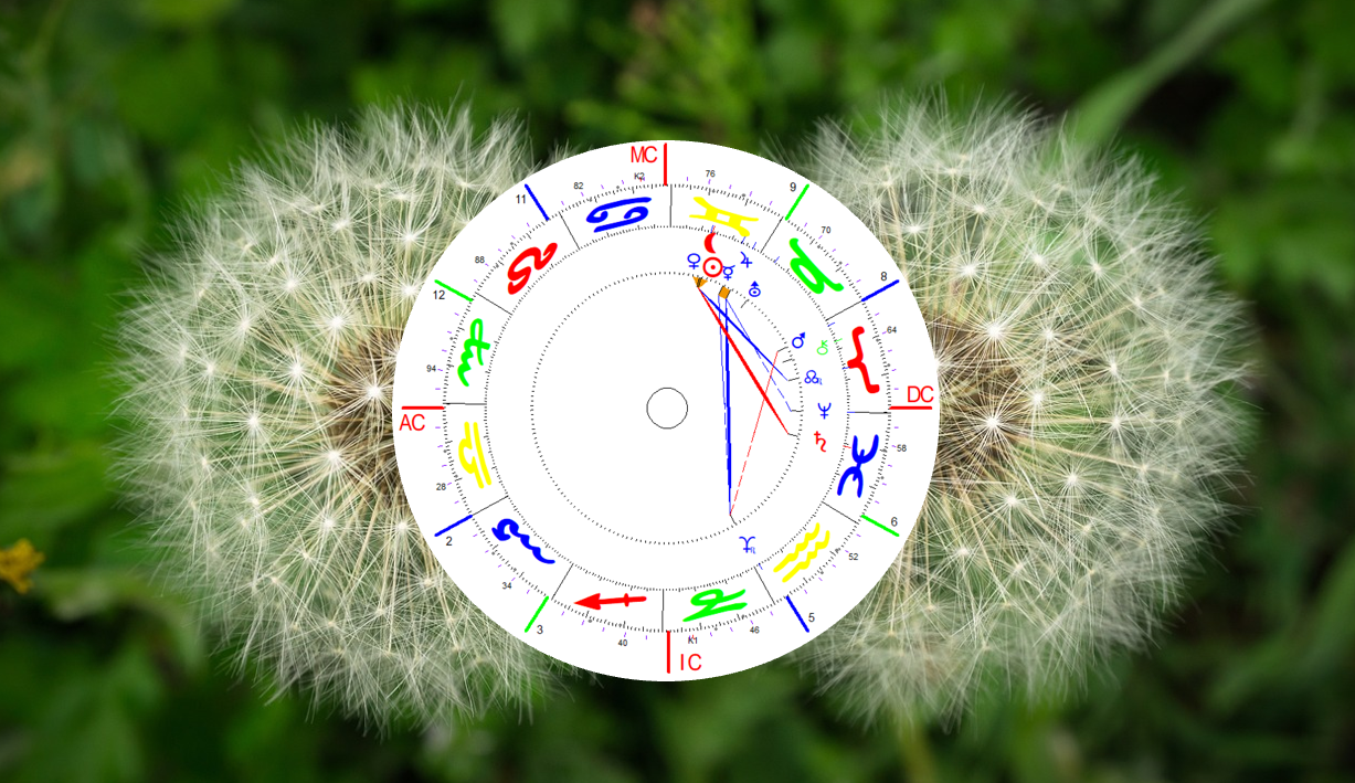 Sonne-Mond mit Saturn im Quadrat: die ICH Planeten sind in sich im Konflikt, weil der Alltag so anstrengend und unmenschlich ist, Mondknoten gibt Gelegenheit zu neuen Kontakten. Jedoch verlangt er ehrliche Selbstdarstellung und Formulierung der Vorstellungen von Begegnung, Ehe und Partnerschaft. Auch für das Gegenüber muss Verständnis gezeigt werden. Verträge sollen verbindlich sein.