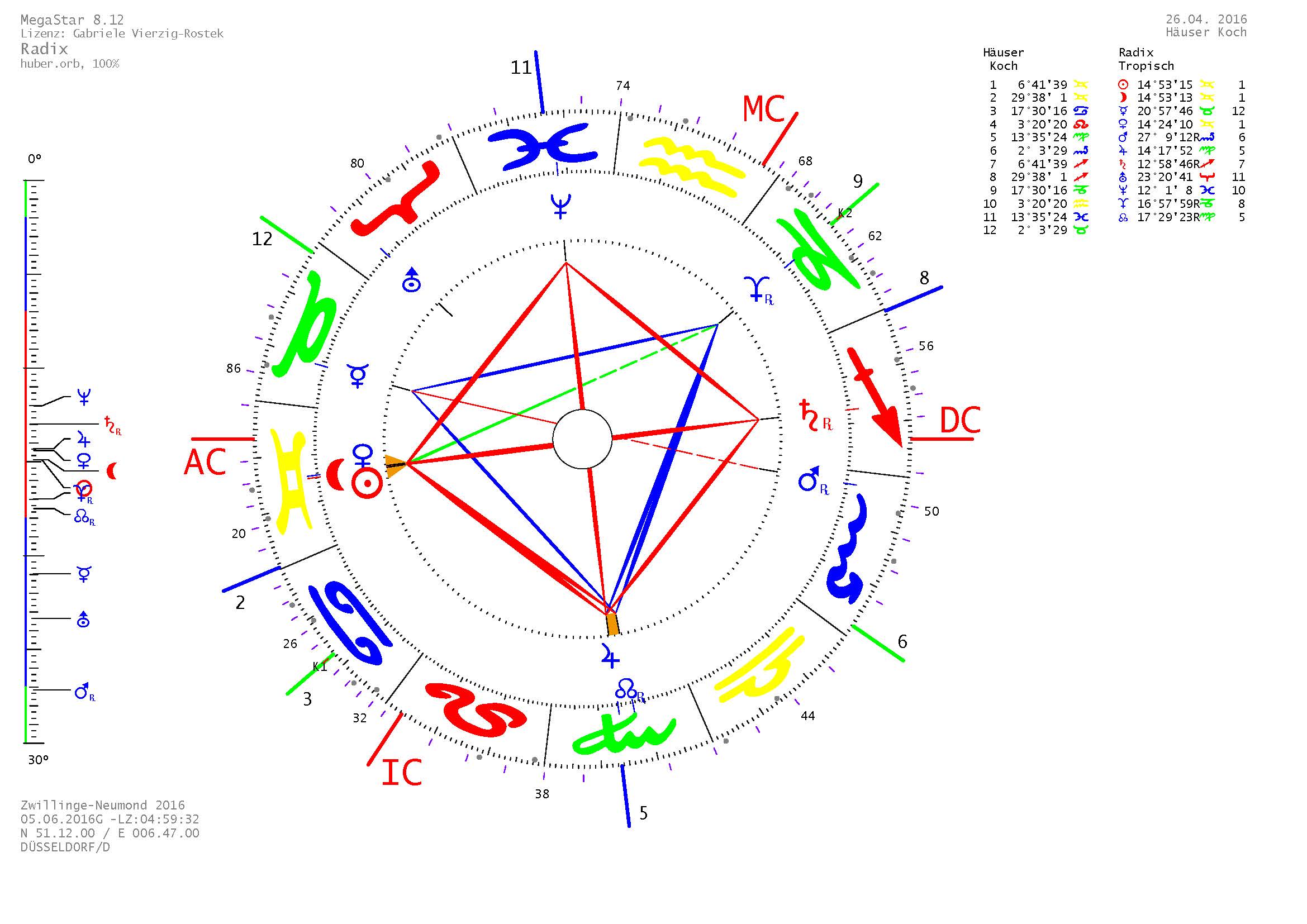Das Aspekt-Bild enthält nur ein latentes Quinkunx als grüne Linie. Wenn dies durch Stress weg fällt, ist das Bild sehr ambivalent und ohne Kompromisse. Mars wäre in dem Fall auch abgetrennt, was Kurzschlusshandlungen durchaus beflügelt. Also bleiben wir alle wachsam!